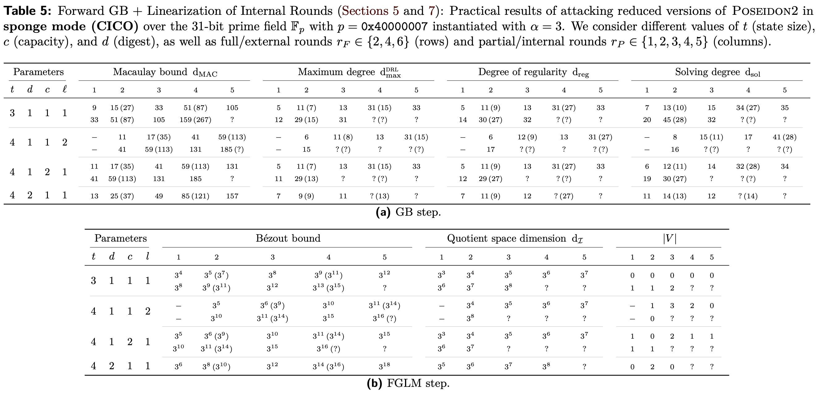 In [GKR25], the authors present a comprehensive analysis of Gröbner basis attacks against Poseidon2 in Sponge mode through Table 5. This analysis is based on a two-step approach: the GB step (Macaulay bound) and the FGLM step (conjectured dI). Subsequently, the authors derive the minimum partial rounds values $r_P$ that can be configured, as shown in Table 3.